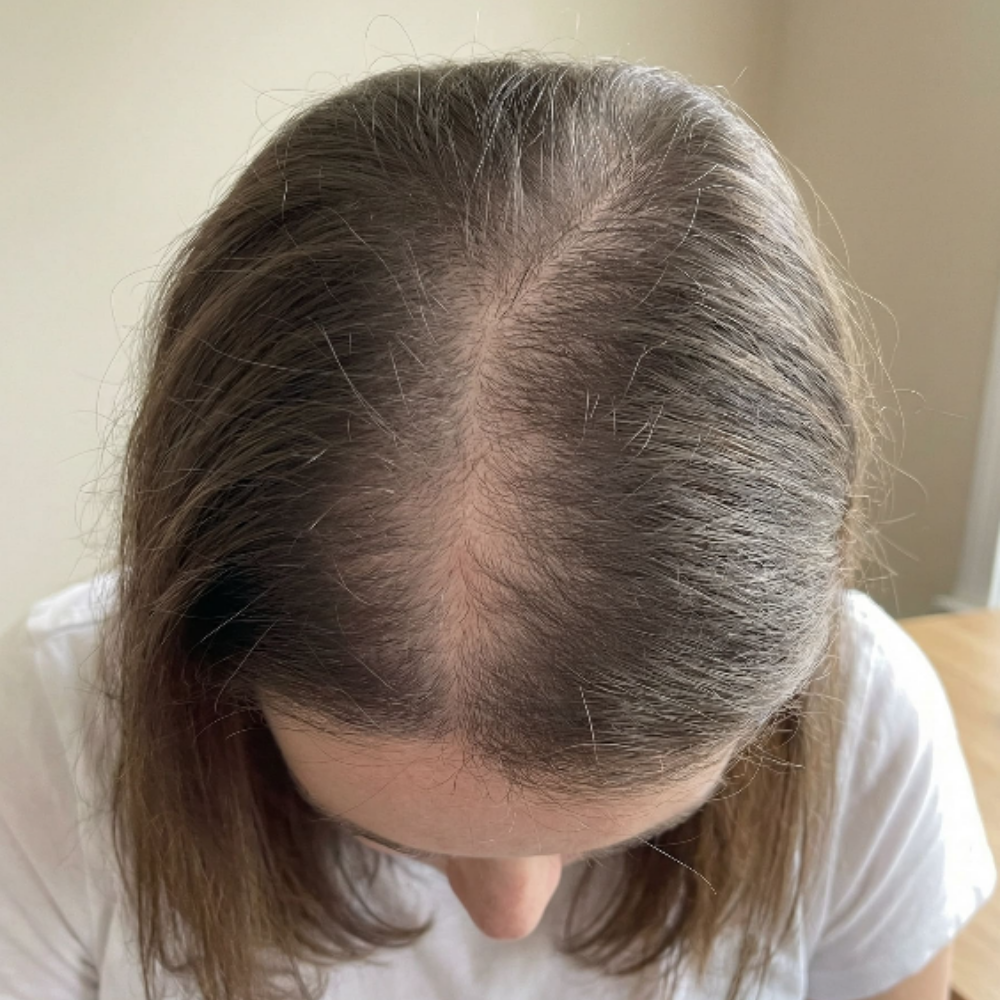 Sehr breiter Scheitel, die Kopfhaut ist über die gesamte Länge sichtbar. Die Haardichte ist nachgelassen, und die Haarfollikel befinden sich in der Ruhephase.