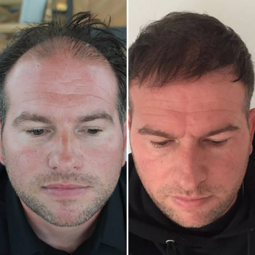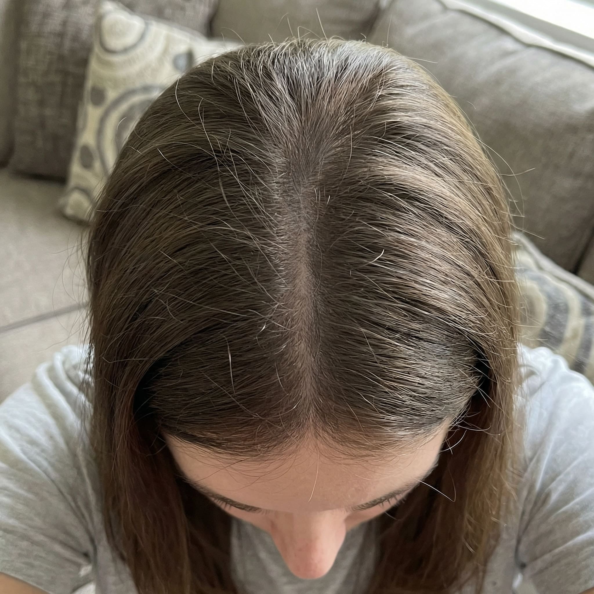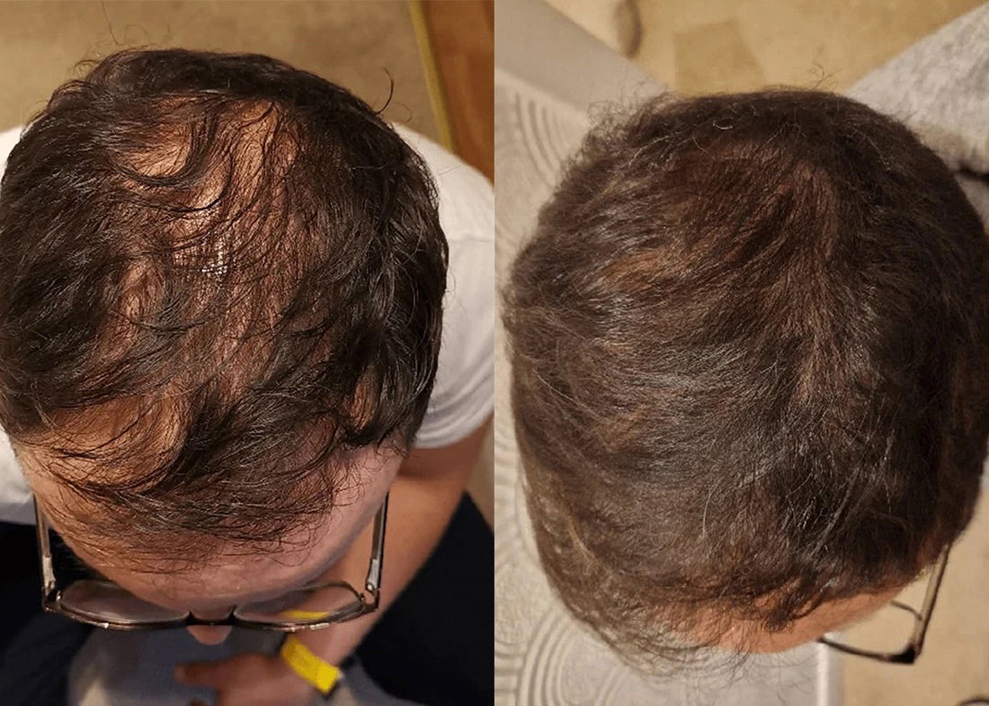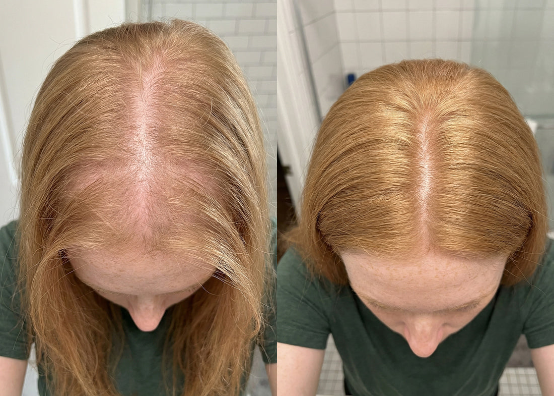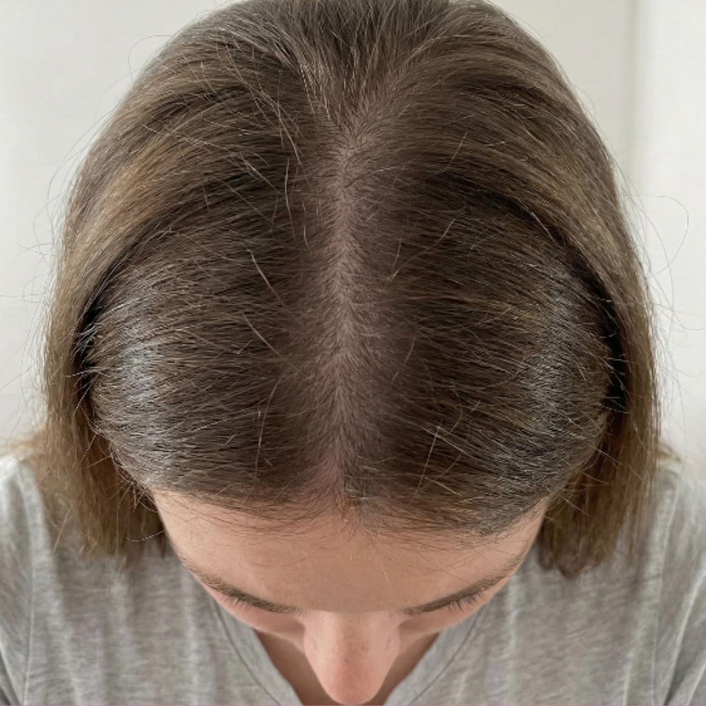 Der Scheitel wird sichtbar enger. Das Haar wird dichter und erhält mehr Halt. Die Kopfhaut wird immer weniger sichtbar.
