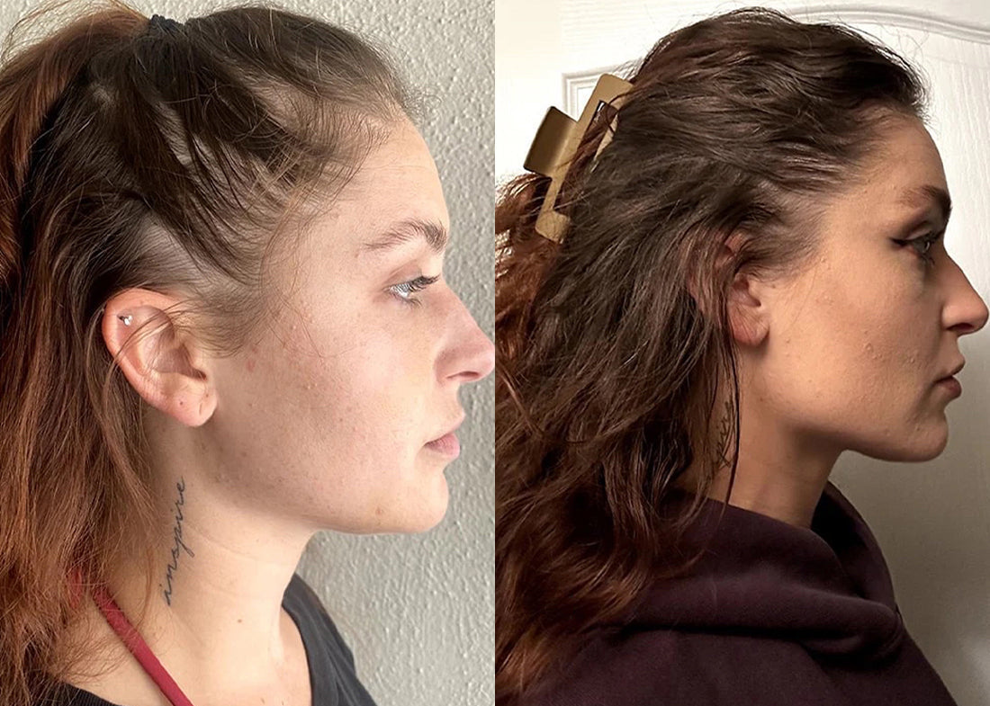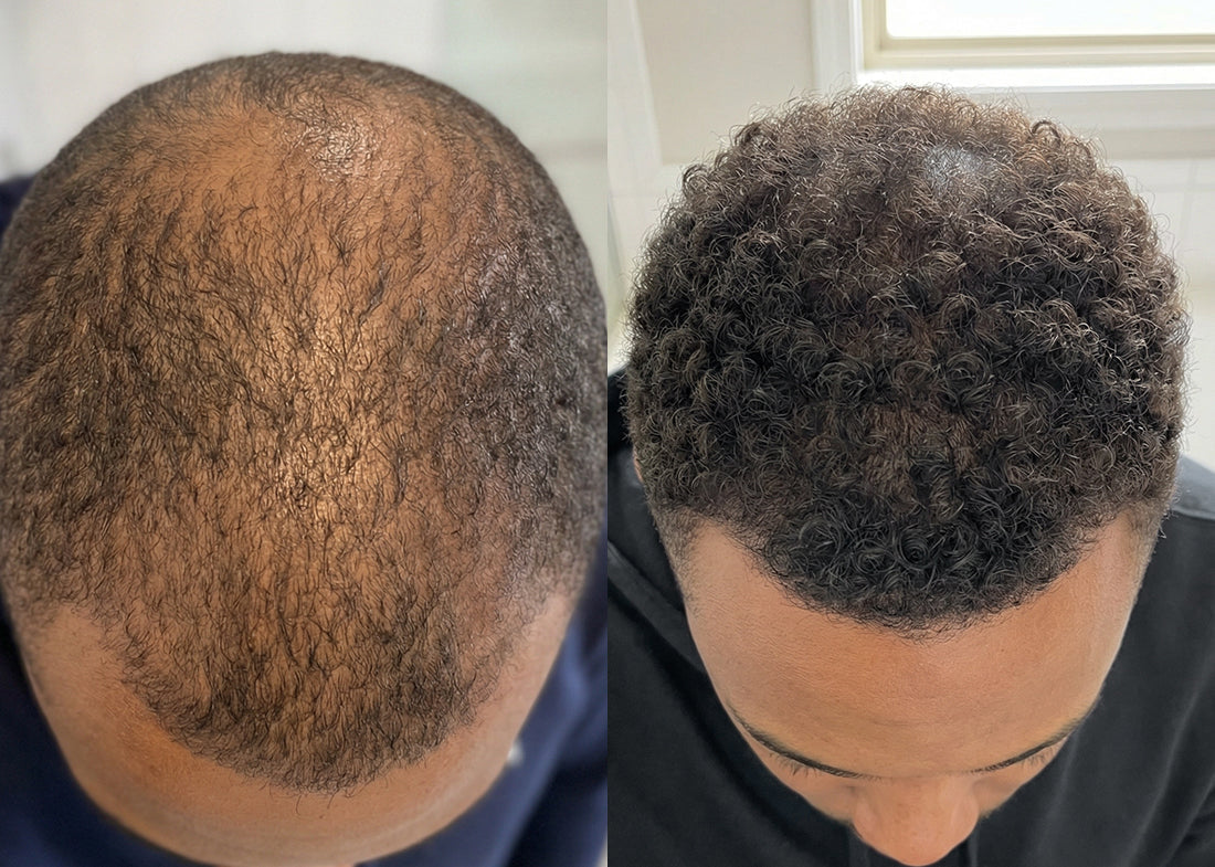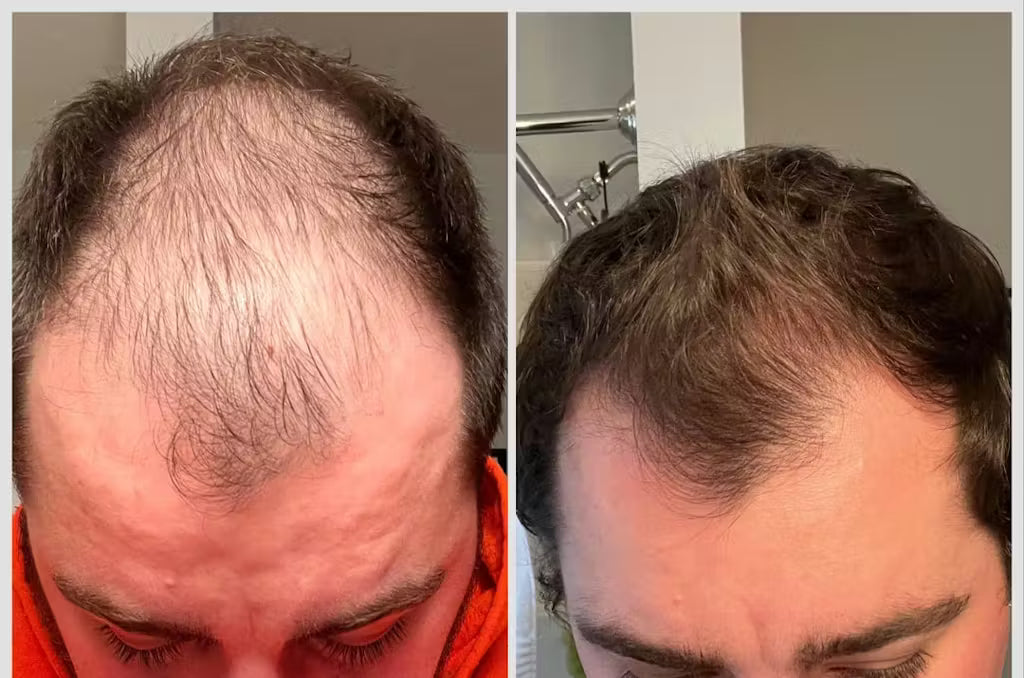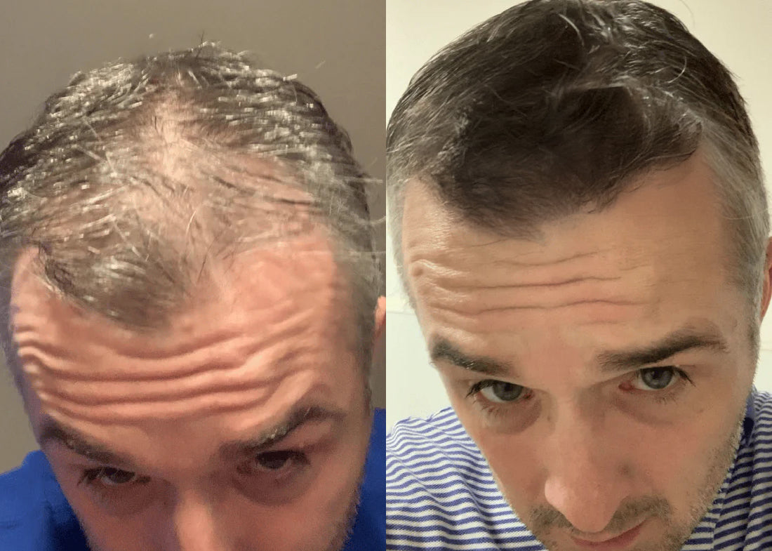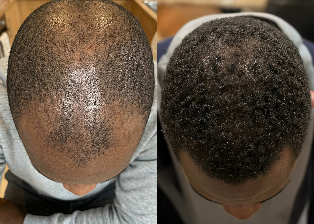 Der Scheitel wird sichtbar enger. Das Haar wird dichter und erhält mehr Halt. Die Kopfhaut wird immer weniger sichtbar.